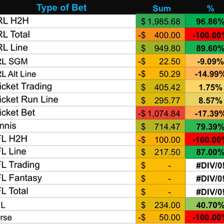 Week 5 was a massive test of discipline and a humbling reminder of the age-old battle between the bottom line and the internal process. While the week ended in a minor loss, the data shows both a worrying and promising trend. NRL skyrocketing and Cricket in freefall. This mightn’t be the worst thing considering the NRL is about to go full swing whilst Cricket has its off-season and is probably the sign I need to know which one to switch off.